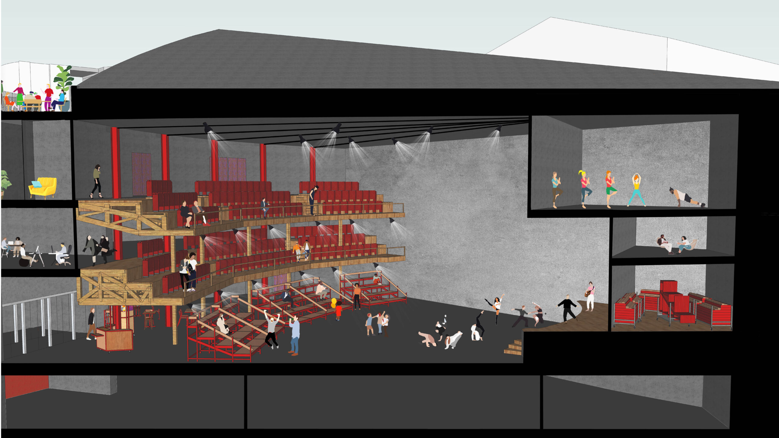 Réhabilitation d’un ancien cinéma en salle de spectacle hybride et modulable pouvant accueillir des représentations de théâtre, musique, danse et diffusion cinéma ; création de loges, espaces de stockage, 3 logements avec cuisine partagée pour artistes en résidence, accueil, bar, espace d’exposition ; conservation des façades d’intérêt patrimonial.