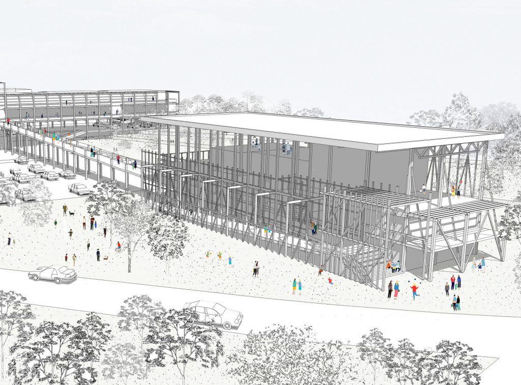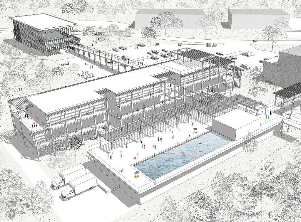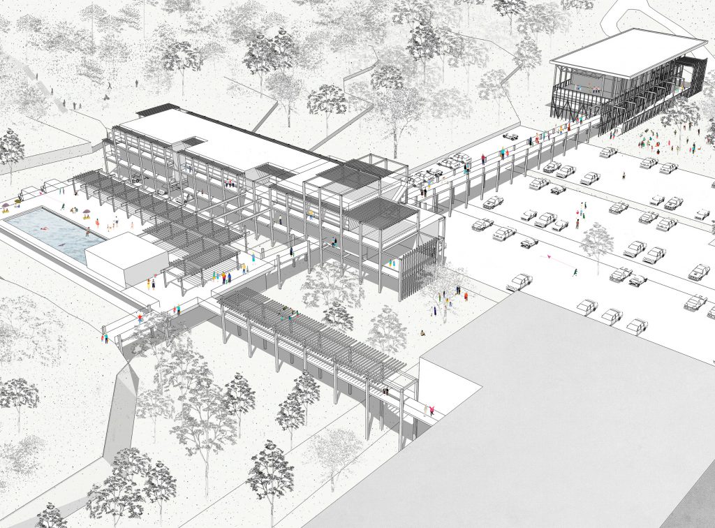 Il s‘agit en fait de proposer un plan séquence, un travelling pour nous accompagner vers le projet. Une des grandes contraintes du programme est d’avaler les places de parkings en surface. On rentre par une pinède, on va la prolonger et s ‘appuyer sur elle pour concevoir le projet. On rentre donc par l’accueil qui distribue les espaces de sports et de séminaires. Cet édifice se prolonge par une rampe pour accéder au niveau d’accueil de l’hôtel. On survole ainsi toutes les places de stationnement, grâce à cette promenade dans les arbres. L’hôtel aura donc des chambres plein sud, avec vues sur le grand paysage et d’autres au nord dont la vue se perd dans la canopée des pins.